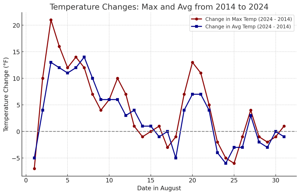 The graph above displays how much surface temperature has changed from August 2014 to August 2024 in San Bernadino County. Through most days of August both maximum and average temperature have increased by nearly 20 degrees Fahrenheit. This pattern will continue, and the data is evident. Climate change is here and coming soon.